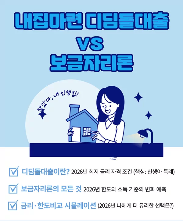 오늘 이 시간에는 내집마련 디딤돌대출과 보금자리론의 차이점과 2026년 예상 정책을 기준으로 두 상품의 최저 금리 조건, 자격, 대출 한도를 완벽하게 비교 분석하여, 소득 및 생애주기별 가장 유리한 대출 전략을 제시하고, 2026년 내집마련 성공 로드맵을 알아보도록 하겠습니다.